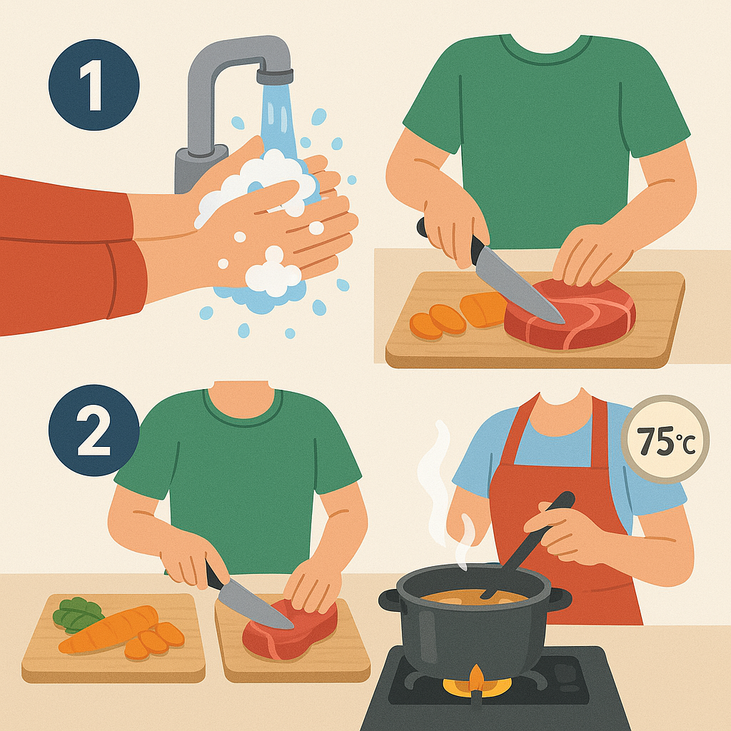 - 조리 전·후 손 씻기 + 도구 분리 사용은 기본