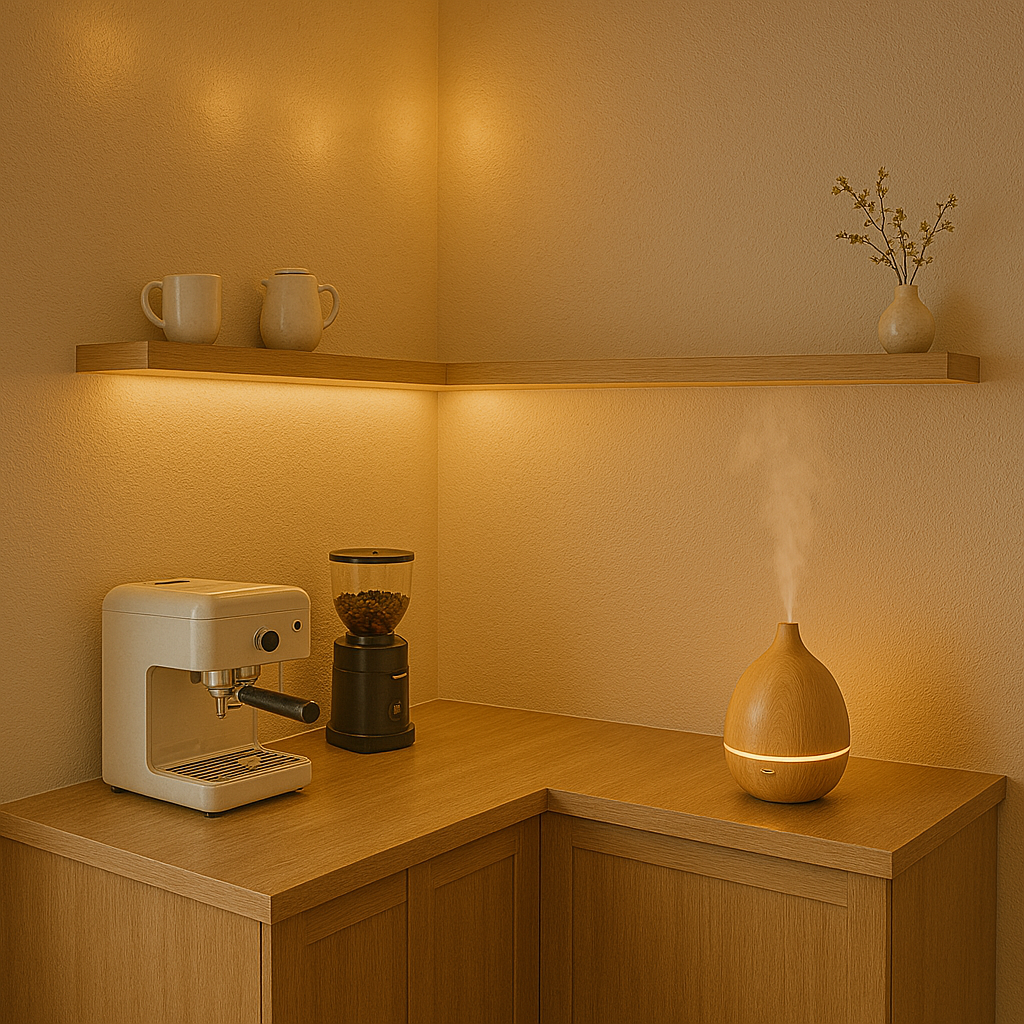 | 디퓨저 | 선반 위, 커피 머신 옆 | 상쾌함, 청량함 |