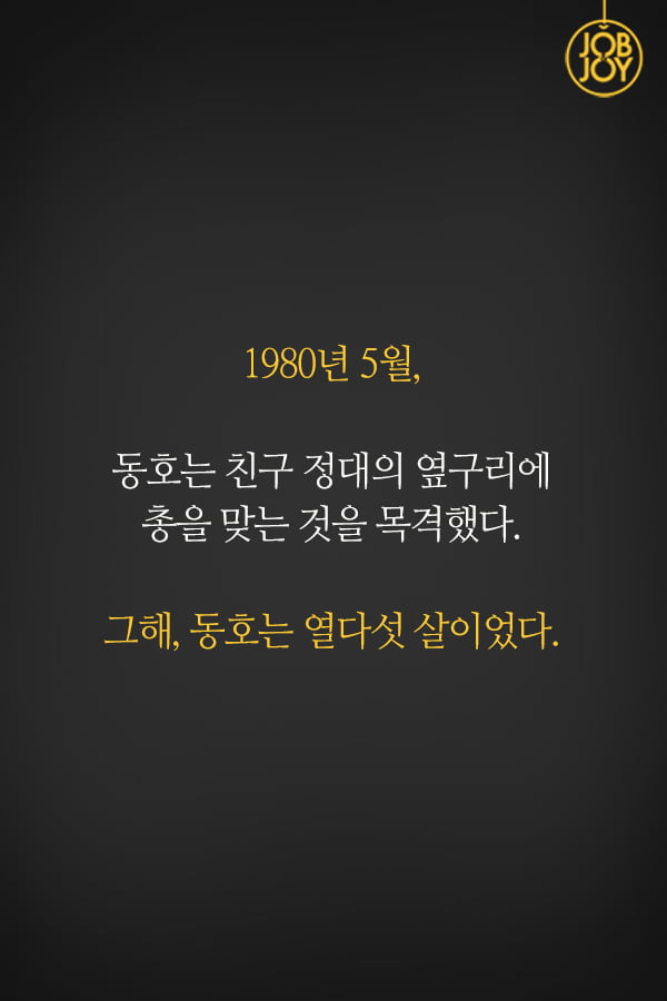 - 동호는 시민방송을 맡으며 동료들과 함께 진실을 알리려다 사망한 열일곱 살 소년