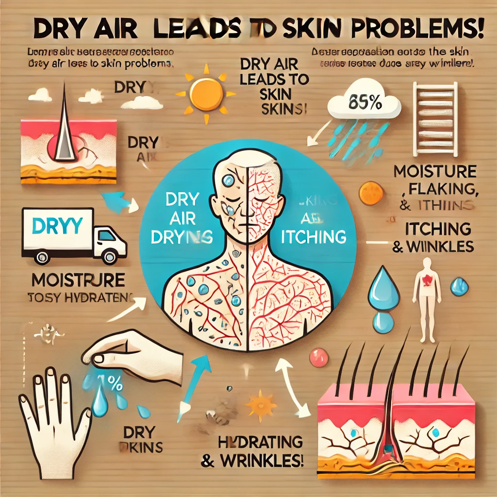 ✔️ 건조한 공기 → 피부 수분이 쉽게 증발하여 당김 & 각질 발생