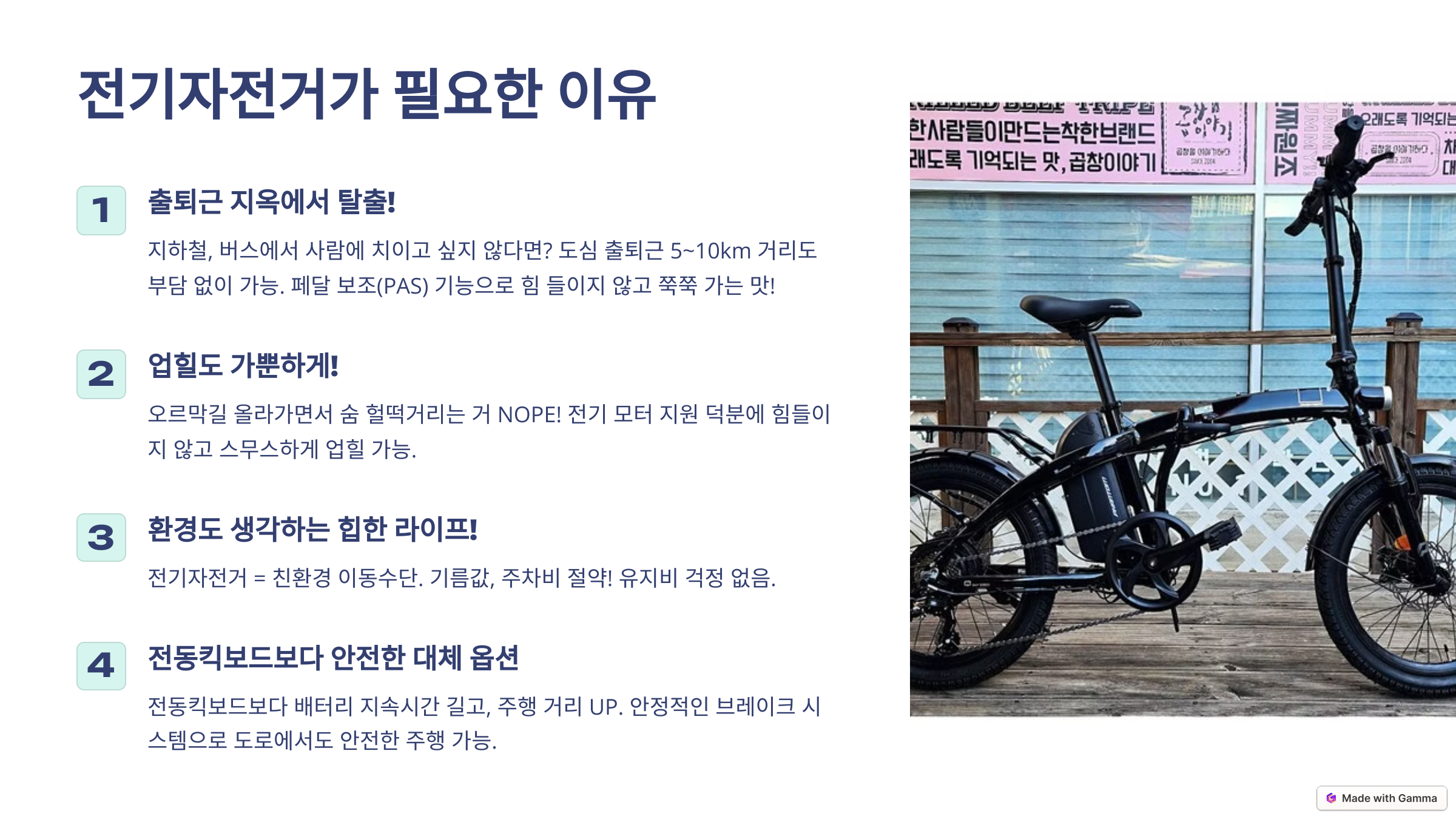 💡 "출퇴근 & 라이딩을 스마트하게! 전기자전거 입문용으로 가성비 최고!"