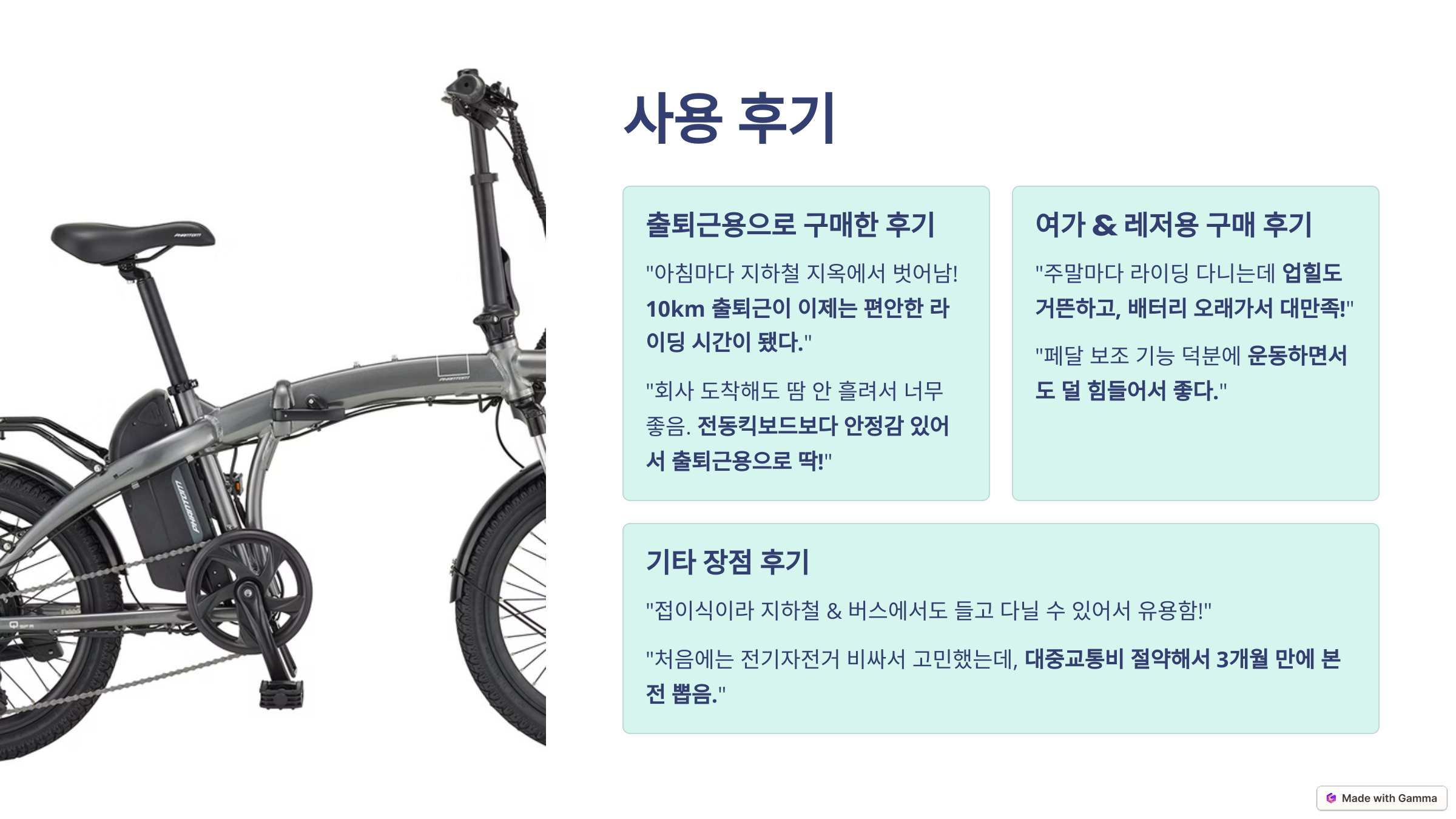 ✅ "회사 도착해도 땀 안 흘려서 너무 좋음. 전동킥보드보다 안정감 있어서 출퇴근용으로 딱!"