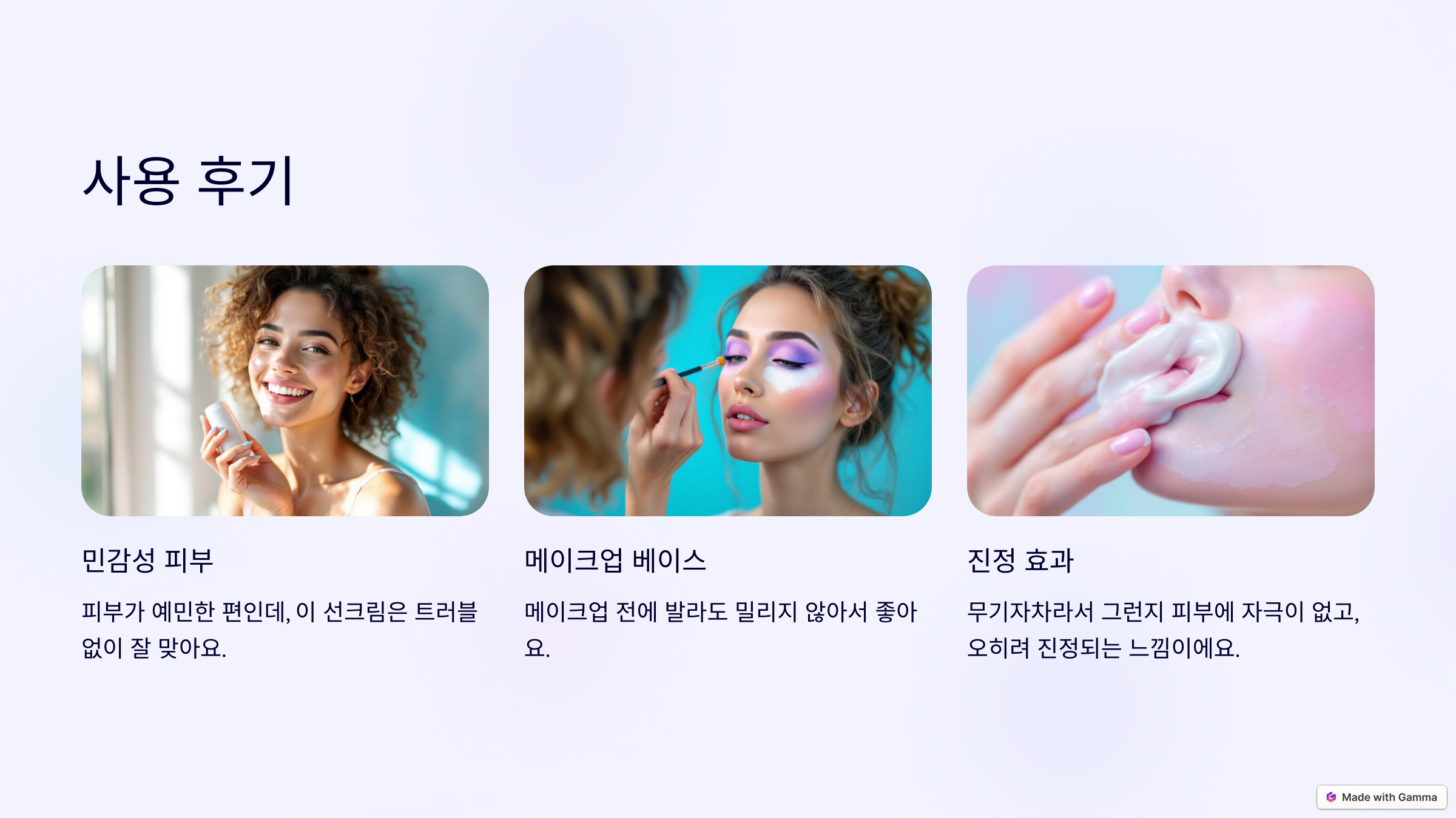 - 피부가 예민한 편인데, 이 선크림은 트러블 없이 잘 맞아요. 발림성도 좋고, 백탁 현상도 거의 없어서 데일리로 사용하기 딱이에요. 😊