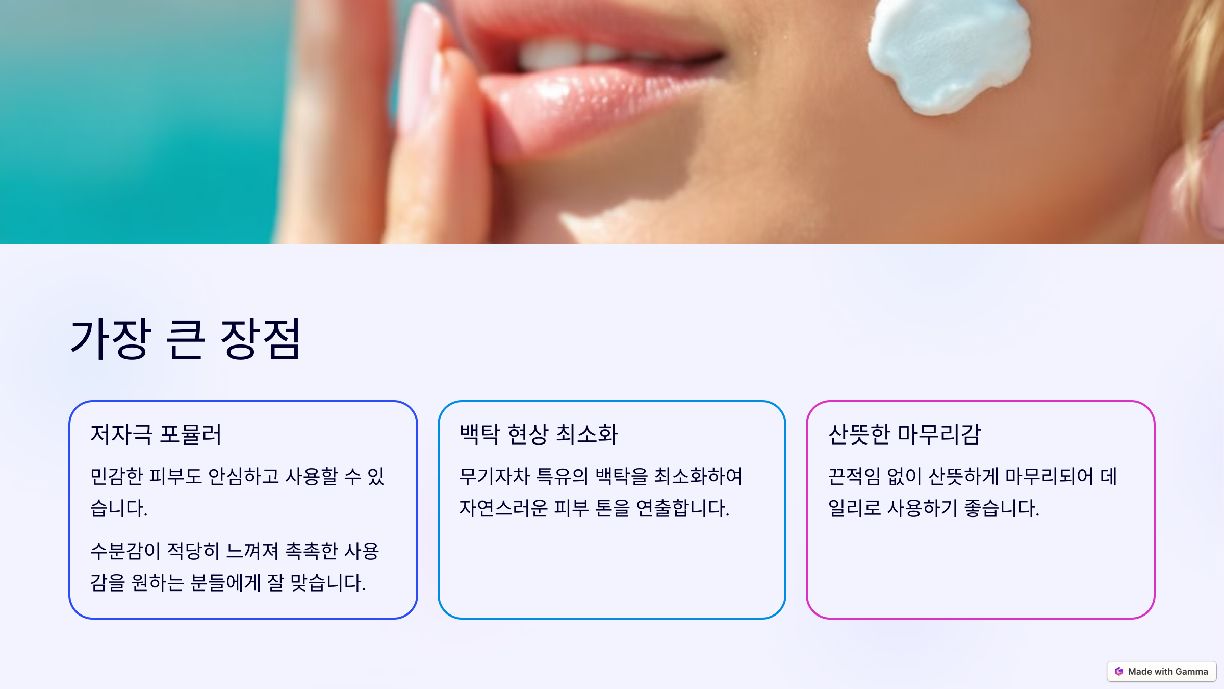 - 저자극 포뮬러: 민감한 피부도 안심하고 사용할 수 있어요. 실제로 화해 앱에서 "수분감이 적당히 느껴져 촉촉한 사용감을 원하시는 분들에게도 잘 맞는 제품"이라는 리뷰가 있어요. 다만, "백탁 현상이 약간 있어 피부 톤에 따라 다소 밝아 보일 수 있는 점은 아쉬운 부분"이라는 의견도 있으니 참고하세요.