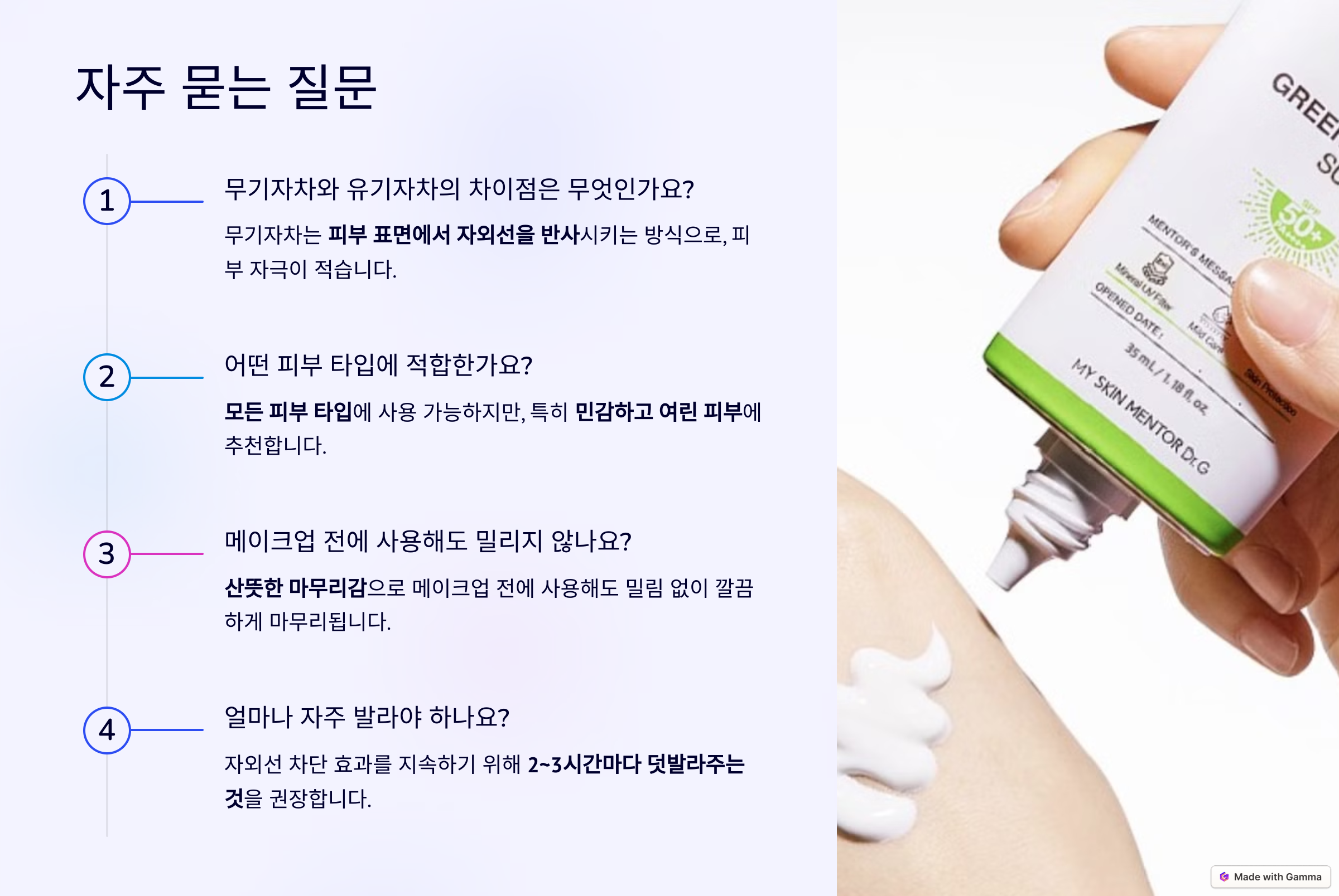 A: 무기자차는 피부 표면에서 자외선을 반사시키는 방식으로, 피부 자극이 적어 민감성 피부에 적합해요. 반면 유기자차는 자외선을 흡수하여 열로 변환시키는 방식으로, 발림성이 좋고 백탁 현상이 적지만 일부 피부에는 자극을 줄 수 있어요.