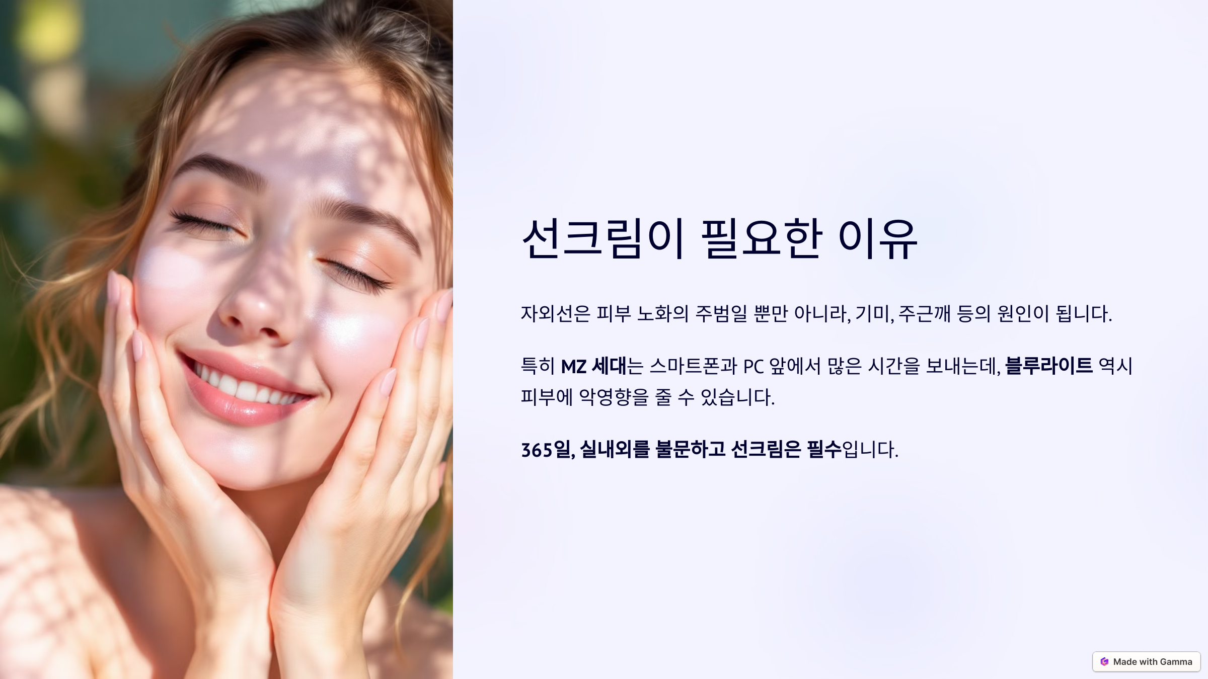 여러분, 자외선 차단제의 중요성, 다들 알고 계시죠? 🌞 자외선은 피부 노화의 주범일 뿐만 아니라, 기미, 주근깨 등의 원인이 되기도 해요. 특히 MZ 세대인 우리들은 스마트폰과 PC 앞에서 많은 시간을 보내는데, 블루라이트 역시 피부에 악영향을 줄 수 있다는 사실! 😱 그러니 365일, 실내외를 불문하고 선크림은 필수랍니다.