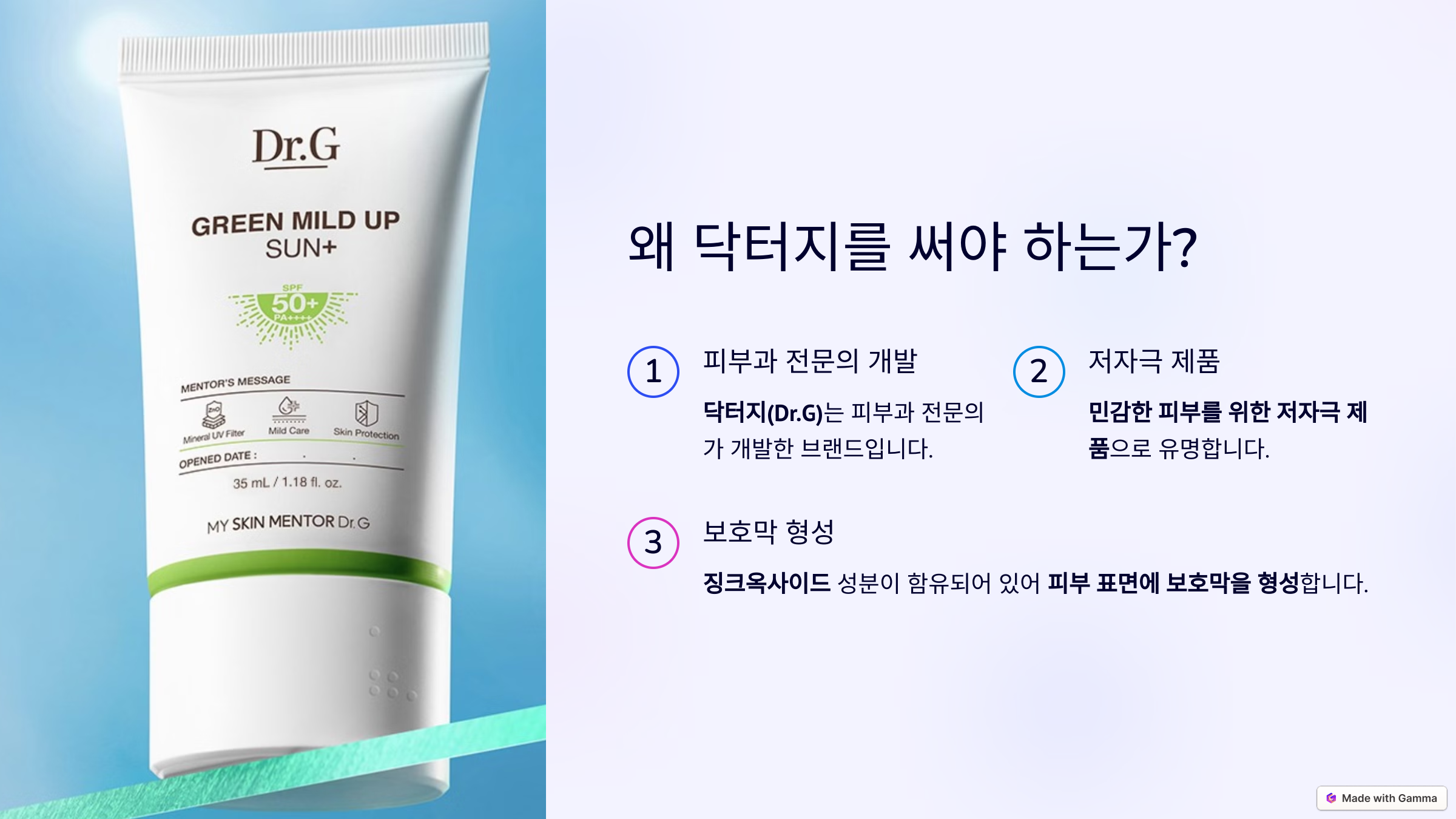 닥터지(Dr.G)는 피부과 전문의가 개발한 브랜드로, 민감한 피부를 위한 저자극 제품으로 유명해요. 특히 그린 마일드 업 선크림은 무기자차로, 피부에 자극을 최소화하면서도 강력한 자외선 차단 효과를 제공하죠. 또한, 징크옥사이드 성분이 함유되어 있어 피부 표면에 보호막을 형성, 자외선을 반사시켜 피부를 안전하게 지켜준답니다. 🌿